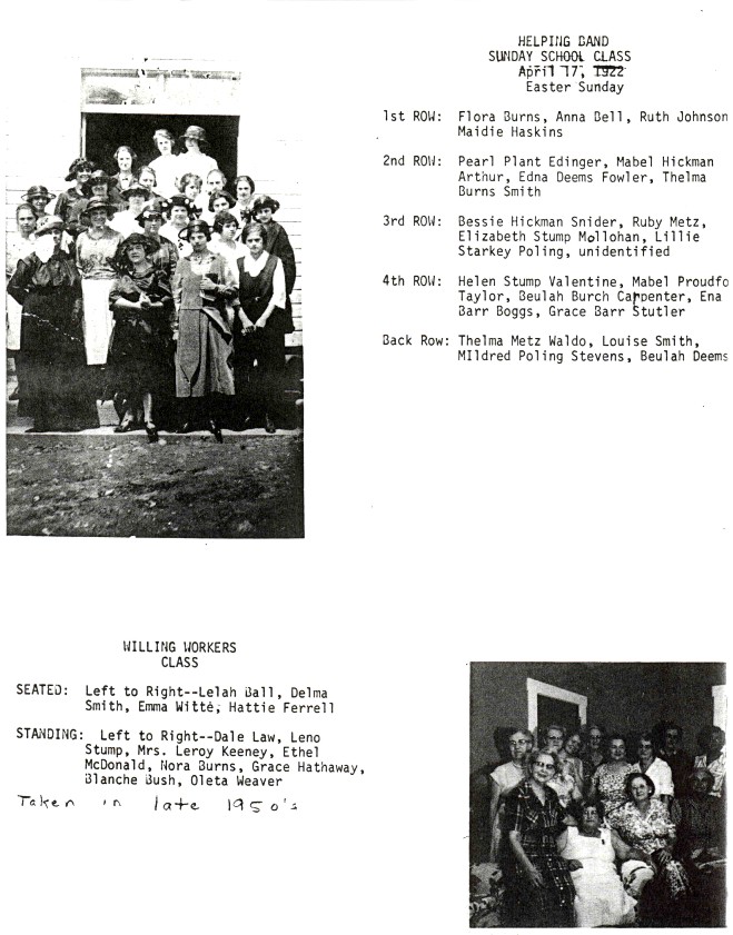 November 6, 1886, a committee composed of four ladies was appointed to solicit money for the purpose of buying a bell for the church. The committee was composed of Sada Scott, Lellia Stump, Mahala Huffman and Emma Westfall. R. L. Marshall was later added to this committee.