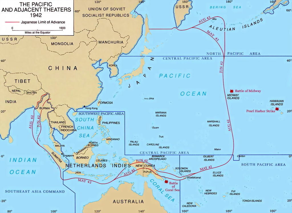 Not sure where all those places are in the Pacific? To see a map of the World War II Pacific Theater as it appeared in August, 1942 click here.