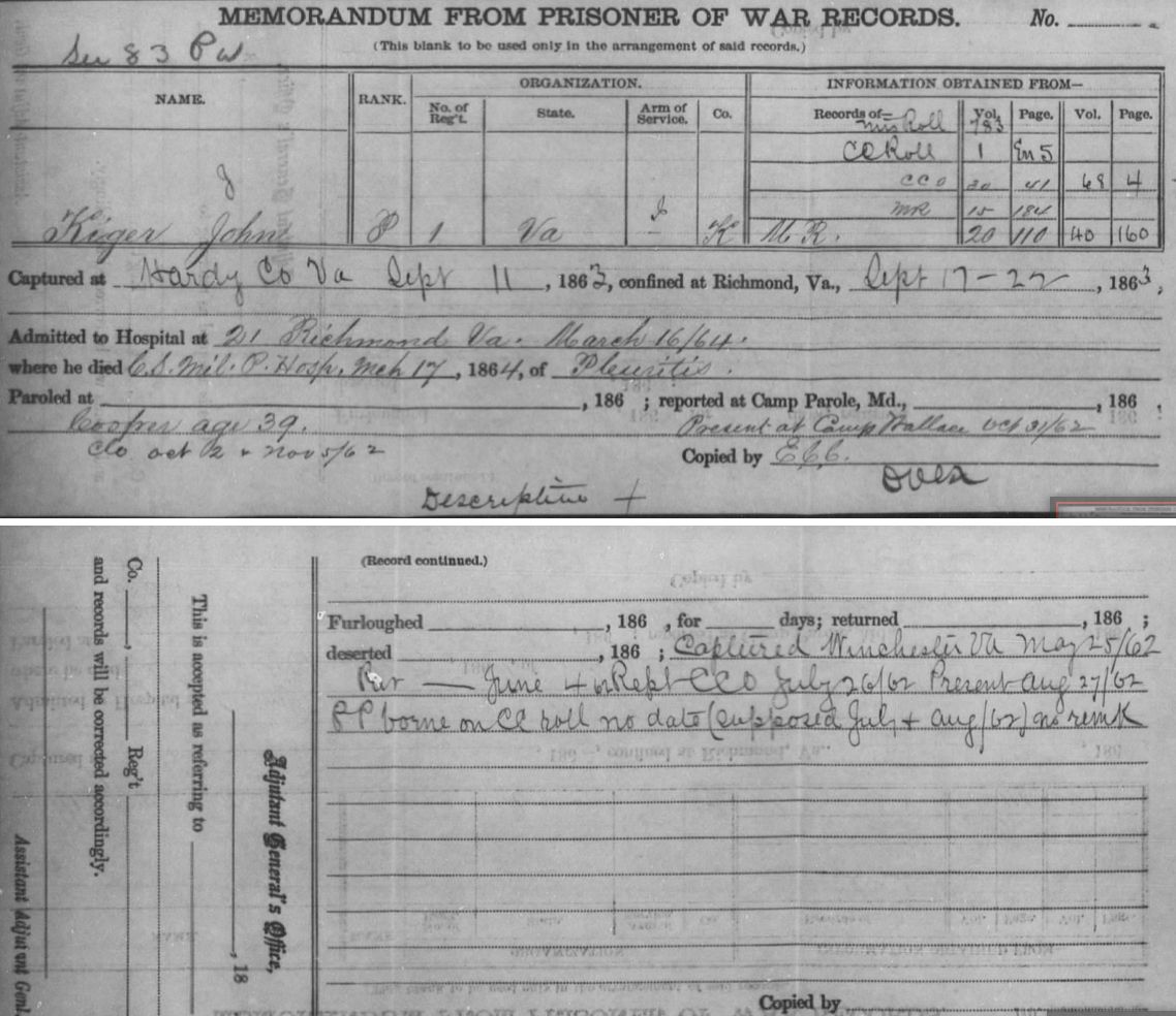 JOHN KIGER/KIGAR, Company "K" 1st West Virginia Infantry. Service Record: Joined for duty and enrolled Oct. 7, 1861 at Wheeling; mustered in Nov. 14, 1861 at Wheeling. He was captured at Winchester May 25, 1862 & in hospital; paroled and at Camp Lew Wallace in Oct. 1862. He was captured again on Sept. 11, 1863 at Moorefield, Hardy Co., (W)Va. According to the POW record, he died while a POW, and his stated age in the Prisoner of War record is 39, occupation Cooper. He died of Pleuritis at the Confederate Hospital at Richmond on March 17, 1864. - From the West Virginia Adjutant General's Records: "Resident of or enrolled at Wheeling; age 38; mustered in Nov 1, 1861 at Wheeling. Cooper, born in Ohio Co., W.Va. Captured by the enemy at Moorefield, W.Va., Sep 11, 1863, and a prisoner of war at date of muster out." - From the W. Va. Adj. Gen. Descriptive Roll for Company K: John Kiger, 38, 5'10"; light hair; blue eyes; fair complexion; born in Ohio County; cooper; enrolled Oct. 7, 1861 at Wheeling. - John Kigar, 33, cooper, was found in the 1860 census of Sherrard, Marshall County, with possible parents, Andrew Kigar, 63, and Hannah, 48. In 1850, Andrew Kiger, 55, and Hannah Kiger, 45, were living in Ohio County. John, the cooper, is not found, but a younger, Hannah, age 20, was also in the home. She married Roger Irwin in 1860 and lived in Sherrard, Marshall County. -- MANY people have identified the son of Andrew and Hannah as John T. Kiger. The soldier's middle initial might have been "T" but he was not the man they claim was the son of Andrew and Hannah. Despite an extensive obituary of John T. Kiger, which states unequivocally who his parents were, the researchers continue to name him as the son of Andrew and Hannah. - No pension claim was filed under this soldier's name. [NO other John Kiger, COOPER, is found. Company K included quite a few close neighbors of the Kigers in Sherrard. Some of them were William H. Morgan, James McHenry, John Tolbert/Talbert, John Bird, Richard Gosney, Joseph Shaw, Otis & Henry Kemple, John McCombs, Peter & George Orum, James Shilling, Ambrose Leach, James Gray, Louis & Peter Criswell.]