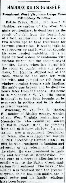Sad story of the SUICIDE OF CHARLES E. HADDOX, ex-warden at the West Virginia State Penitentiary.