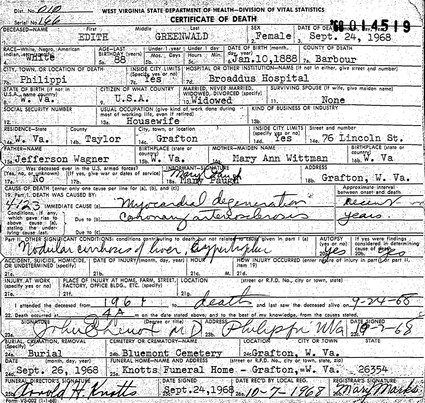 d | 24 Sep 1968 | Philippi, Barbour, WV [ death-certificate #14519 ] | bur: Bluemont Cem. | ||||
