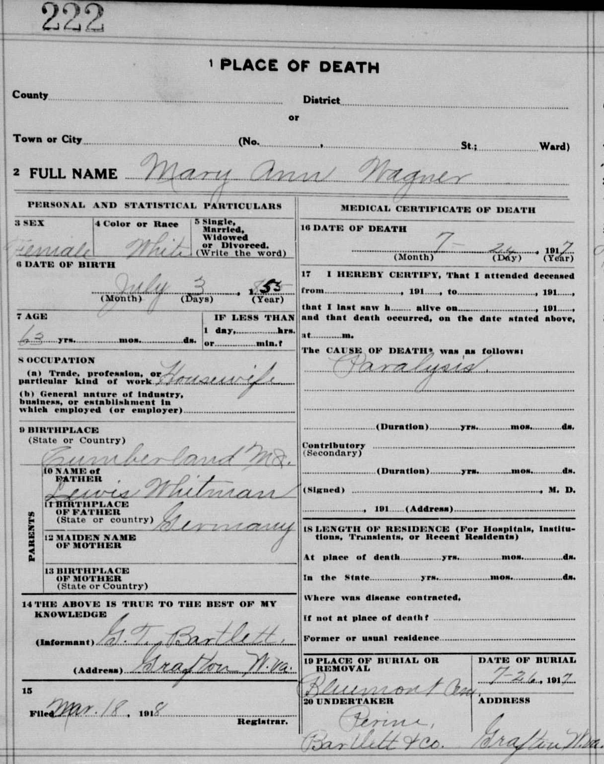 Death | 24 Jul 1917 | Grafton, Taylor, West Virginia [ death-certificate, page 222 ] | |||||