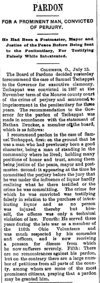 SAMUEL TSCHAPPAT – is a native of Monroe county, having been born in Switzerland township, May 19, 1845. Ever since his seventeenth year he has been in the employ of the government, with the exception of two years. On the 22nd of Aug 1862, he enlisted in the 116th OVI, serving until the close of the war. He participated in the following engagement: Winchester, Opaquan, Fisher’s Hill, Cedar Creek, in the principal battles around Richmond, at the surrender of Lee, and in numerous skirmishes and small engagements. He was shot in the knee while on the skirmish line at Winchester. His brother, DAVID TSCHAPPAT, was starved to death in Libby prison, and is now buried in Green Lawn Cemetery, at Columbus, Ohio. Samuel was Assistant United States Marshal in 1870 in Monroe county. He was assistant-postmaster at Powhattan Point for five years. He still holds, and has filled, since 1876, the position of post-master at Clarington. Elizabeth DUERR became his wife at Clarington, Ohio, Jan 18 1874. They have two children: Emma Gertrude, born Jul 6 1876, and Katie, May 6 1879. Samuel’s parents, Jacob & Susannah TSCHAPPAT, settled in this county in 1825. John & Catherine DUERR are the parents of Mrs. TSCHAPPAT. Address, Clarington, Monroe county, Ohio. ["History of Monroe County, Ohio," by H. H. Hardesty & Co., Publishers, 1882]